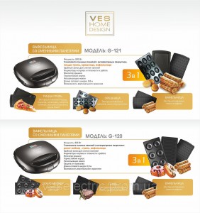 Характеристики вафельницы 3в1 Ves G-120 Мощность: 800 Вт Напряжение, частота: 220-240 В, 50/60 Гц 3 комплекта съемных панелей с антипригарным покрытием: вафельница - для приготовления тонких вафель донат мейкер для выпечки пончиков гриль - для приготовления гриль блюд и различной выпечки Удобный замок для снятия панелей Индикаторы нагрева и готовности к работе Фиксатор крышки Термостойкий корпус Нескользящие ножки Защита от перегрева Длина сетевого шнура: 0,8 м Возможность вертикального хранения Производитель вафельницы-гриль - тм VesElectric (Испания).