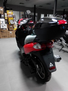 На SP150S-17 установили легкосплавные 17-ти дюймовые колеса. Он имеет современный вид. Достаточно вместительный бардачок. Мощный бензиновый мотор(4 такта), объем цилиндра которого составит 149 см. куб. Легкость старта обеспечивается электростартером и кикстартером.