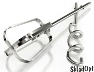 Венчики с плоскими спицами и крюки для теста из нержавеющей стали в комплекте.