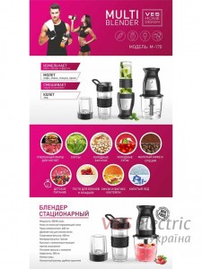 | Дополнительные особенности | Коктейльный стакан Материал стаканов: Тритан (Tritan) Стаканы с силиконовыми кольцами против скольжения Кофемолка Измельчение мяса Двойной нож |